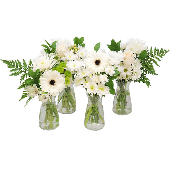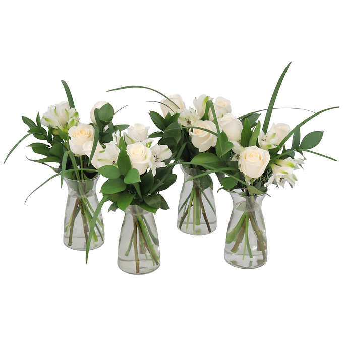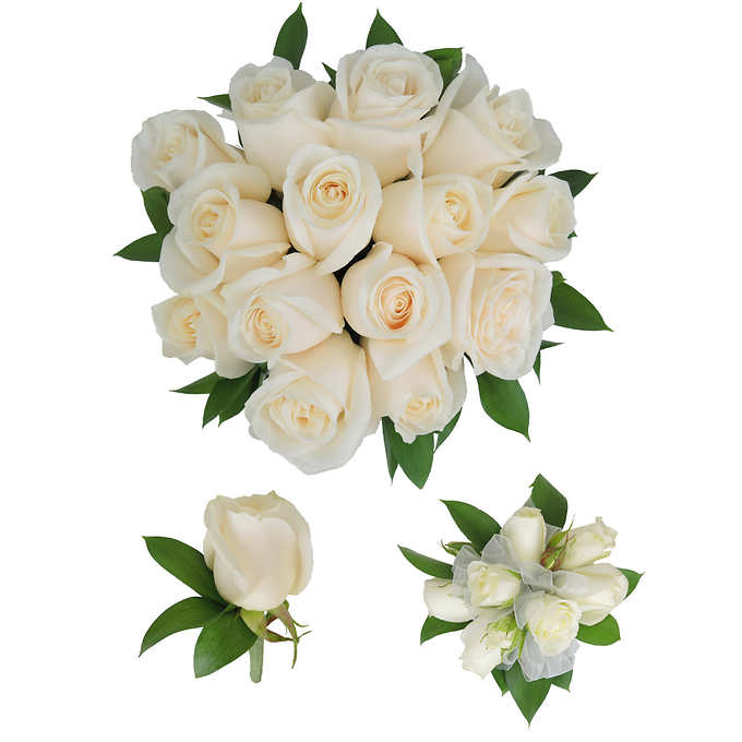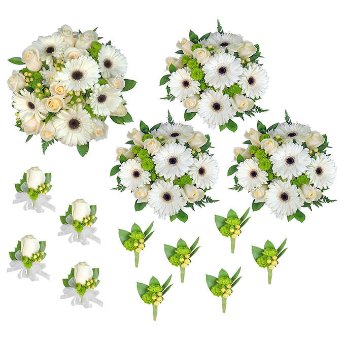Ensemble Cortège Nuptial Beauté (Blanc – 1 bouquet pour demoiselles d’honneur, 1 corsage, 1 boutonnière)