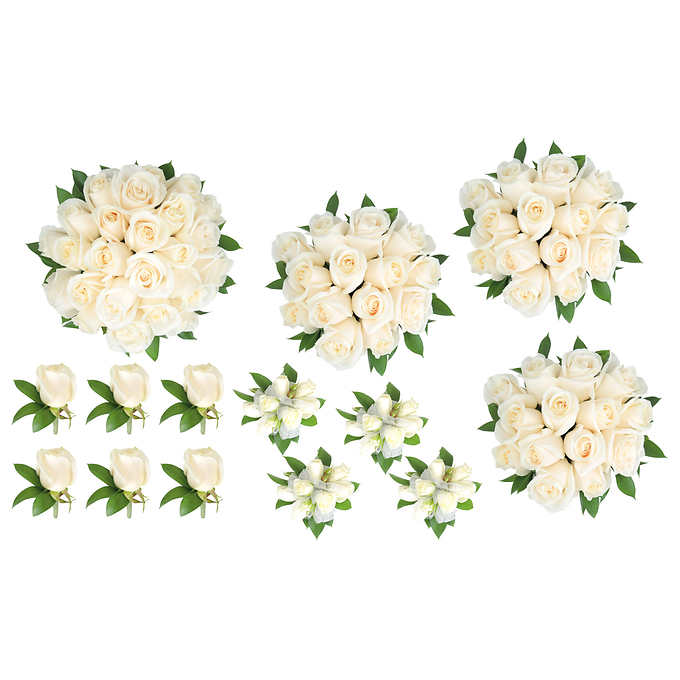 Ensemble Cortège Nuptial Beauté (Blanc – 1 bouquet de mariée, 3 bouquets pour demoiselles d’honneur, 4 corsages, 6 boutonnières)