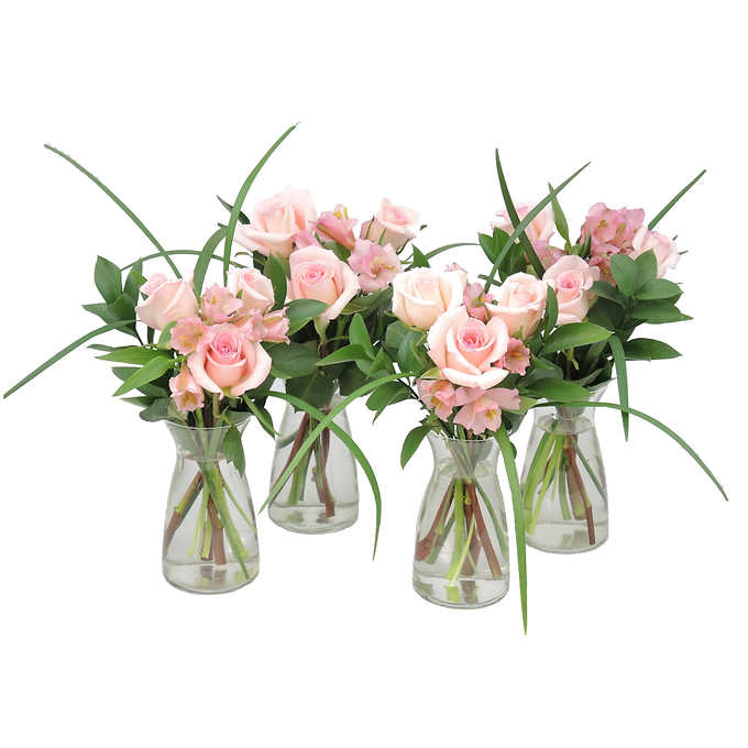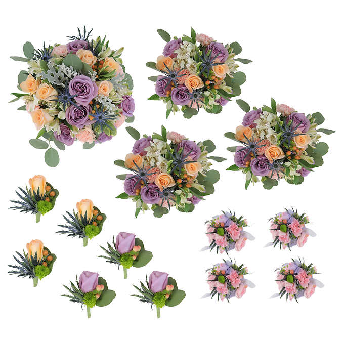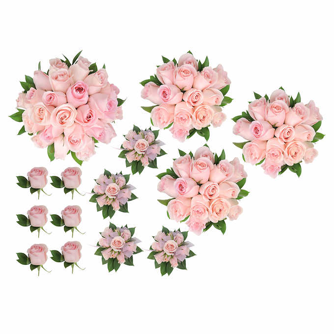 Ensemble Cortège Nuptial Romantico (Rose – 1 bouquet de mariée, 3 bouquets pour demoiselles d’honneur, 4 corsages, 6 boutonnières)