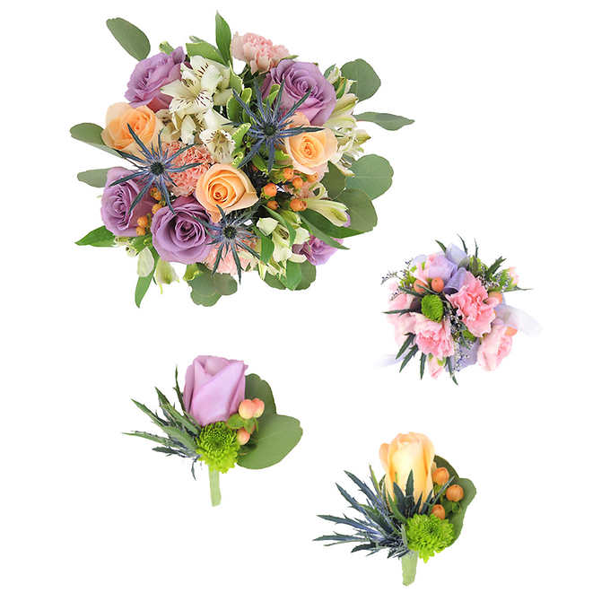 Ensemble Cortège Nuptial Jardin (1 bouquet de mariée, 3 bouquets pour demoiselles d’honneur, 4 corsages, 6 boutonnières)