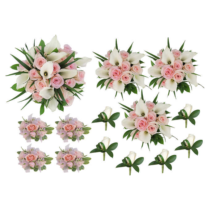 Ensemble Cortège Nuptial Rose (Blanc – 1 bouquet de mariée, 3 bouquets pour demoiselles d’honneur, 4 corsages, 6 boutonnières)