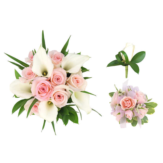 Extra Cortège Nuptial Rose (Blanc – 1 bouquet demoiselle d’honneur, 1 corsage, 1 boutonnière)