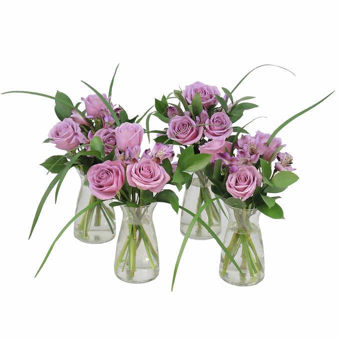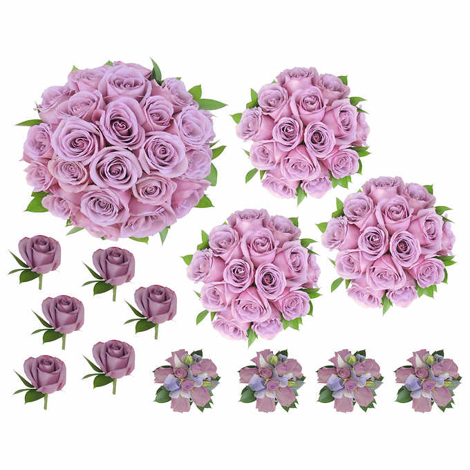 Ensemble Cortège Nuptial Rose (Mauve – 1 bouquet de mariée, 3 bouquets pour demoiselles d’honneur, 4 corsages, 6 boutonnières)