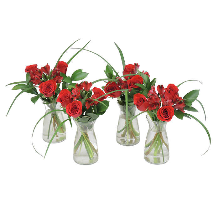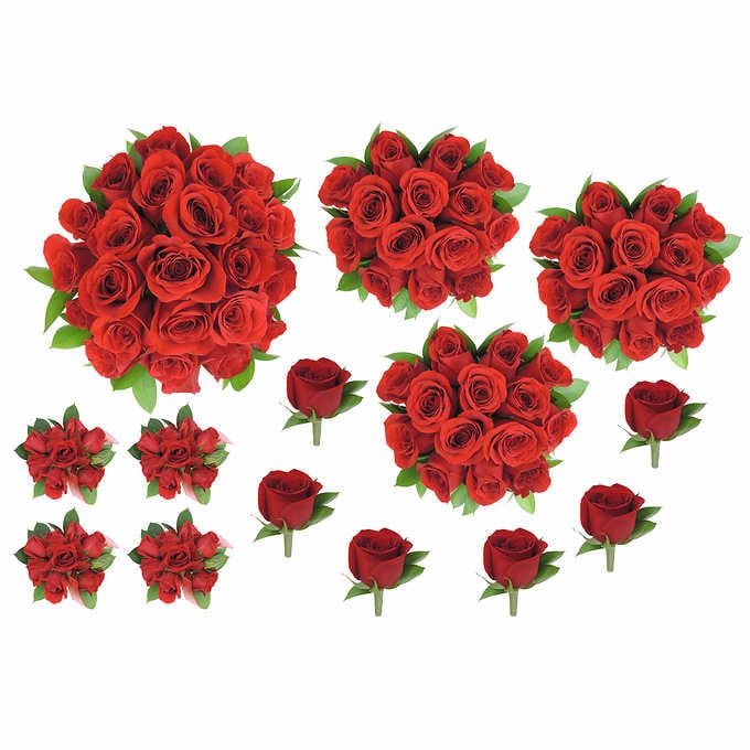 Ensemble Cortège Nuptial Rose (Rouge – 1 bouquet de mariée, 3 bouquets pour demoiselles d’honneur, 4 corsages, 6 boutonnières)