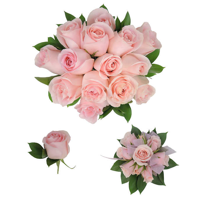 Extra Cortège Nuptial Rose (Rose – 1 bouquet demoiselle d’honneur, 1 corsage, 1 boutonnière)